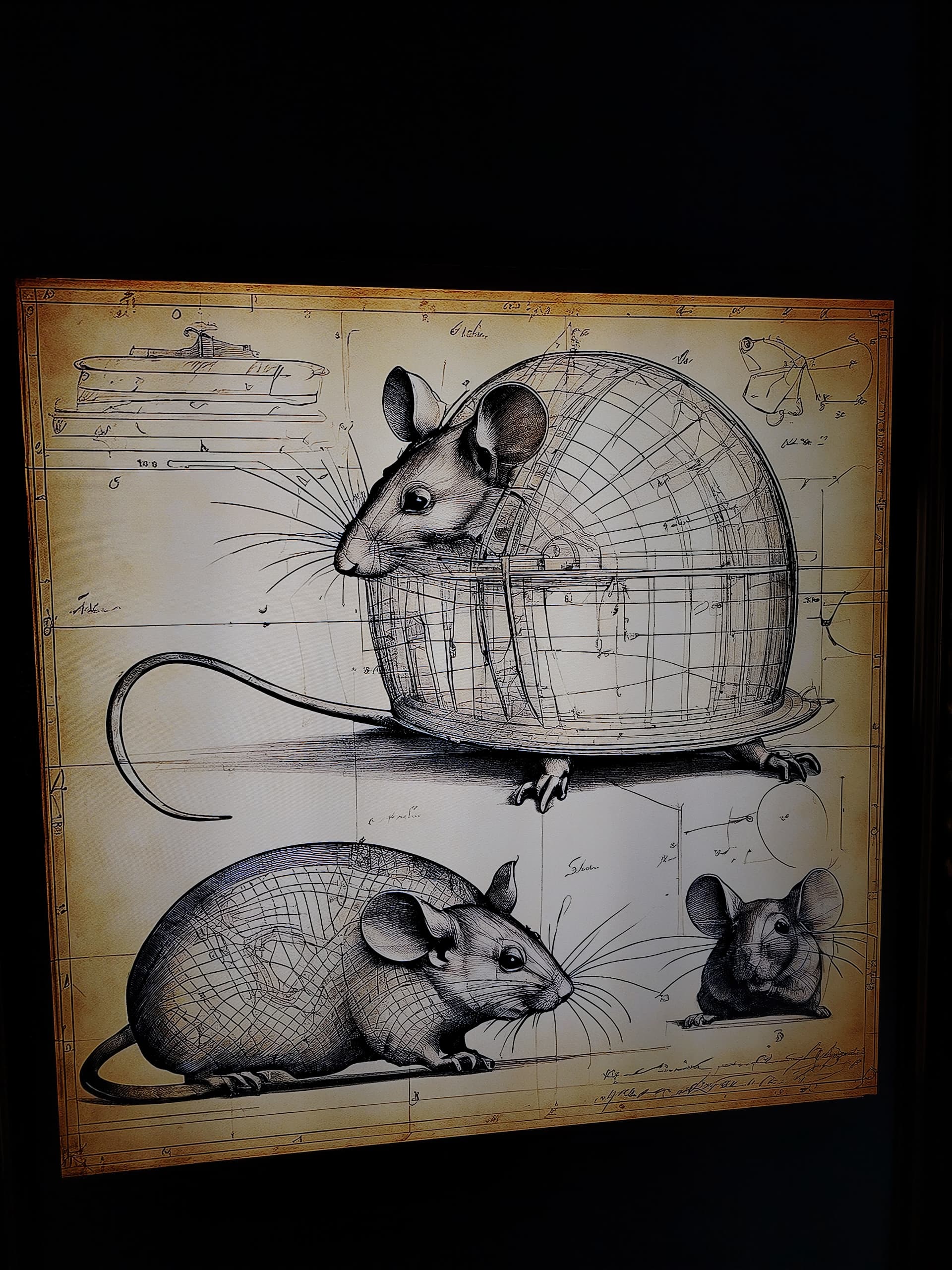 Visa izstāde būtībā ir vidēji liela telpa ar atsevišķu ekrāniem un spoguli nosegtu kasti tās centrā. Centrālajā kastē uz trim maziem ekrāniem tās iekšpusē tiek radītas AI generētas da Vinci skices ar vardēm, slāvu kara ķiverēm un retro mašīnām un visādam visādībām. Īsti domu nesapratu, bet ok