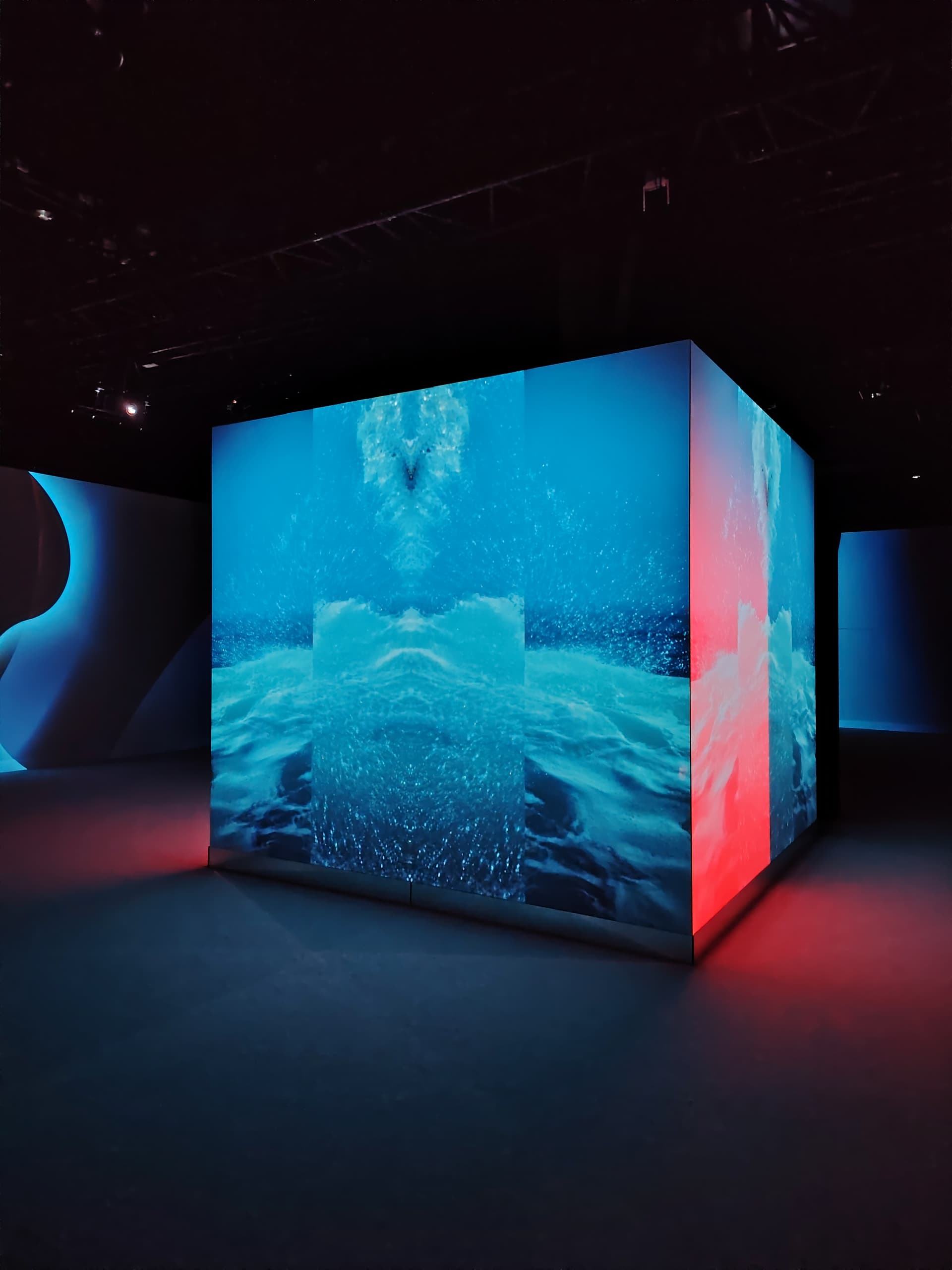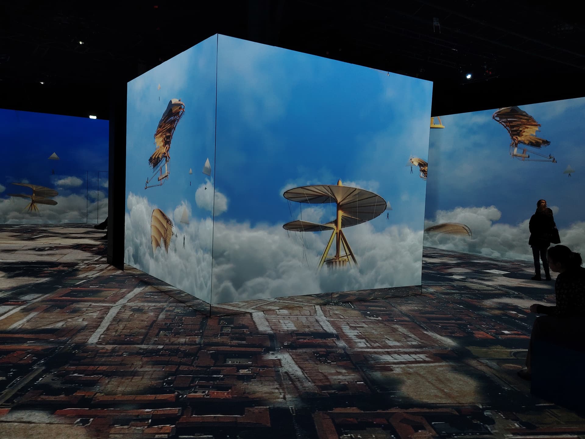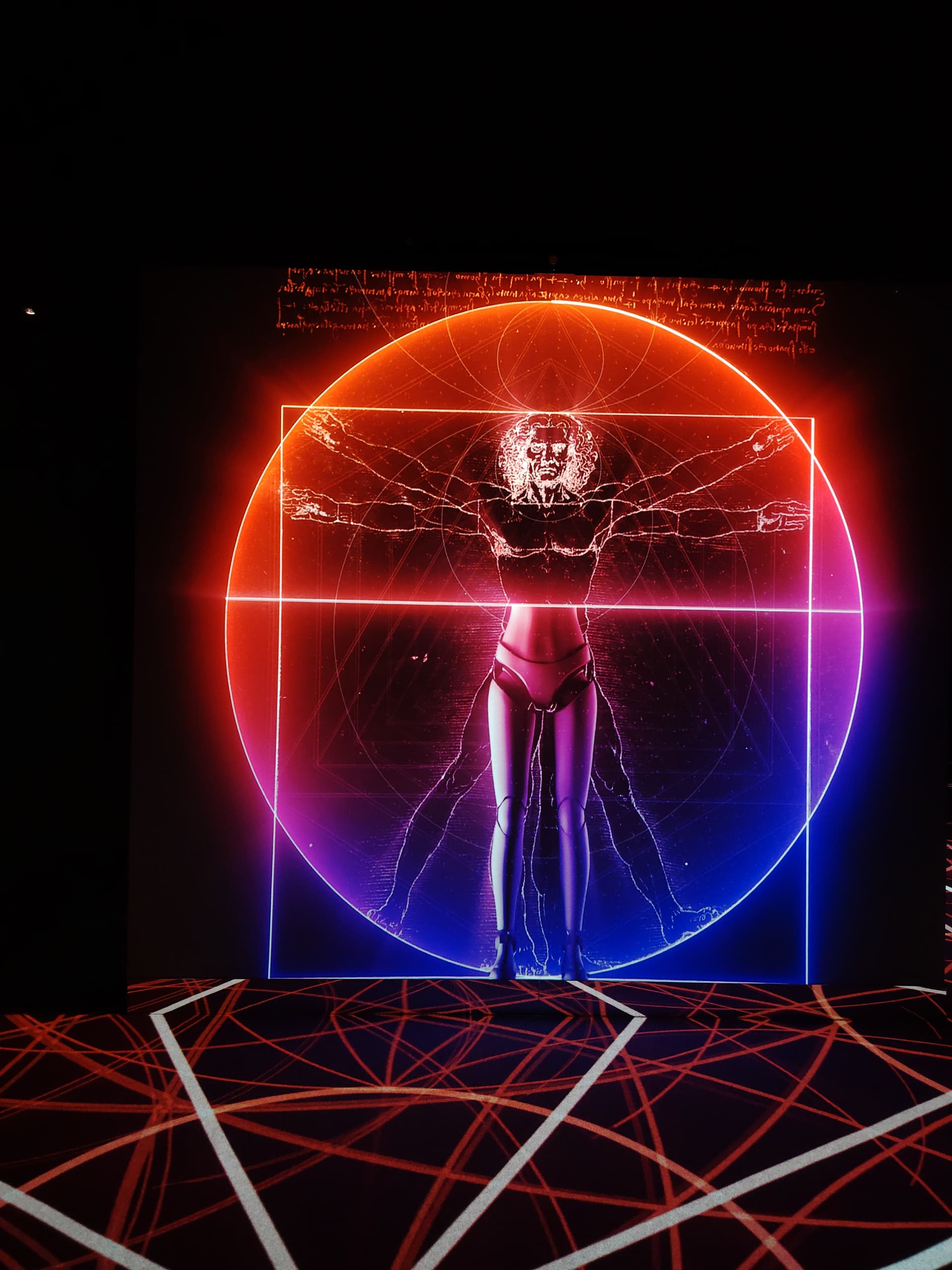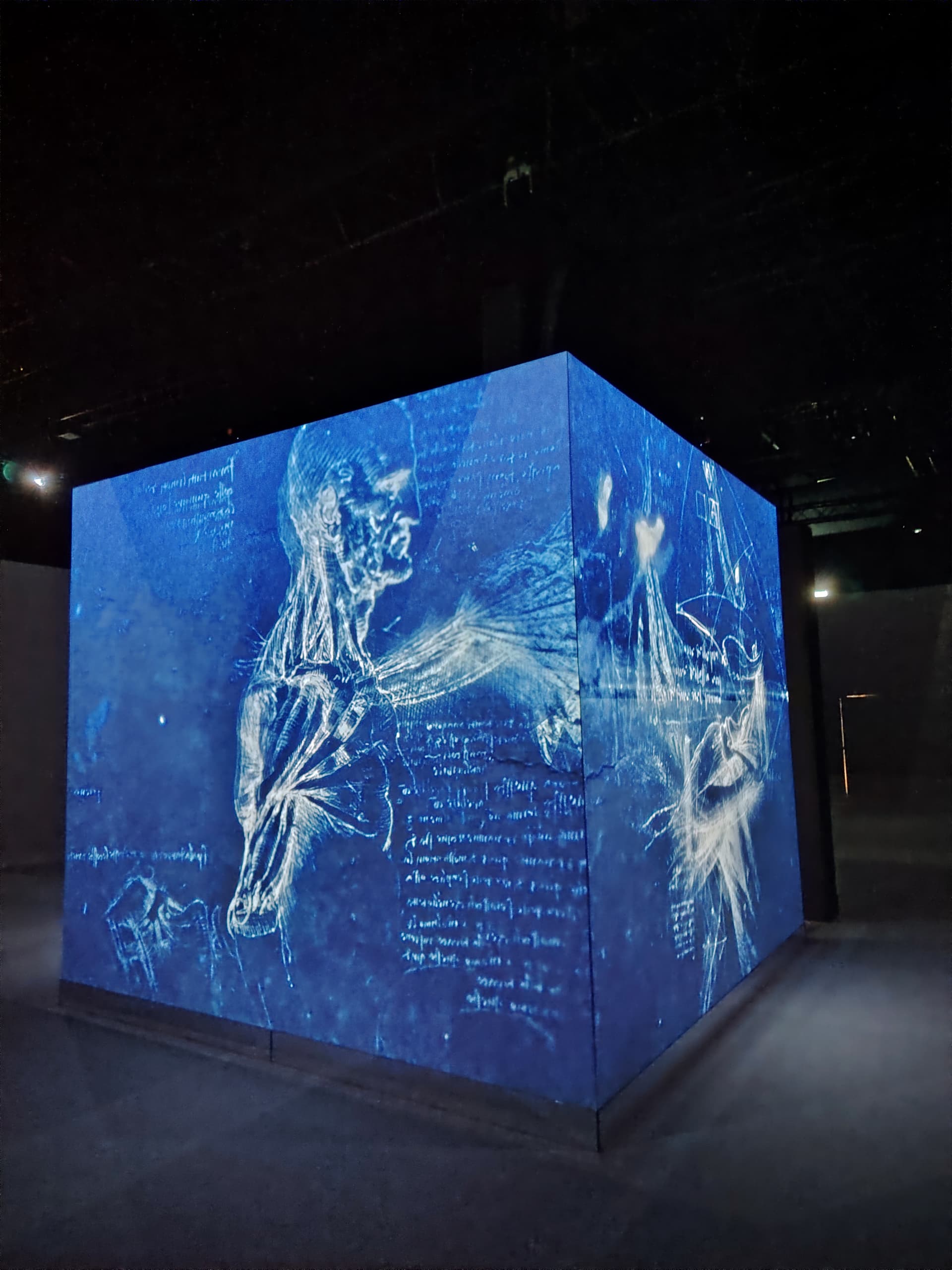 Ārpus mazās kastes uz lielās telpas grīdas un sienām tika projecēts vizuāli skaists, aizraujošs gaismas šovs, kuram bija pāris problēmas, bet par tām vēlāk. Figurēja gan viņa gleznas un anatomijas skices, kas tika vietām samērā interesanti uzlabotas ar modernām tehnoloģijām, tās atdzīvinot, vai izmainot.