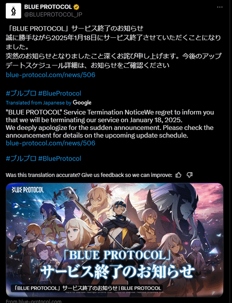 Blue Protocol ir Japāņu mmorpg, kurš pašlaik atrodas closed beta stāvoklī. Spēli aktīvi izstrādā Bandai Namco un ir mājieni par spēles ielaišanu arī Eiropas un Amerikas spēļu tirgū. Pašlaik nav zināms ļoti daudz par spēles mehānismiem un sīkumiem, bet ik pa laikam parādas jauna informācija, ko iespējams izlasīt Blue Protocol DB (fan made website about newest updates related to game).