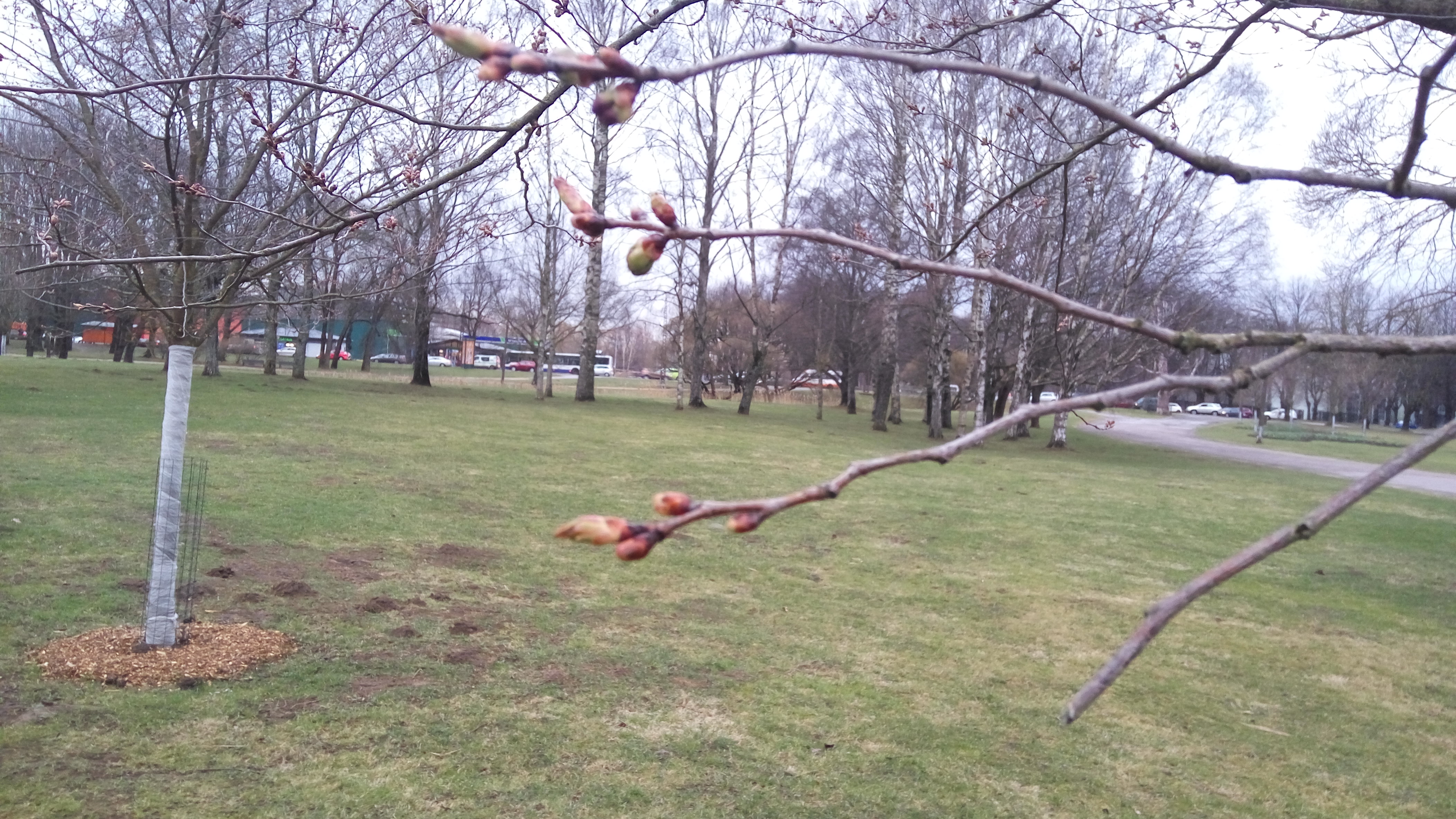 03.04.19. 7:48 - zaļgani pumpuri, koku stumbri ietīti plēvē