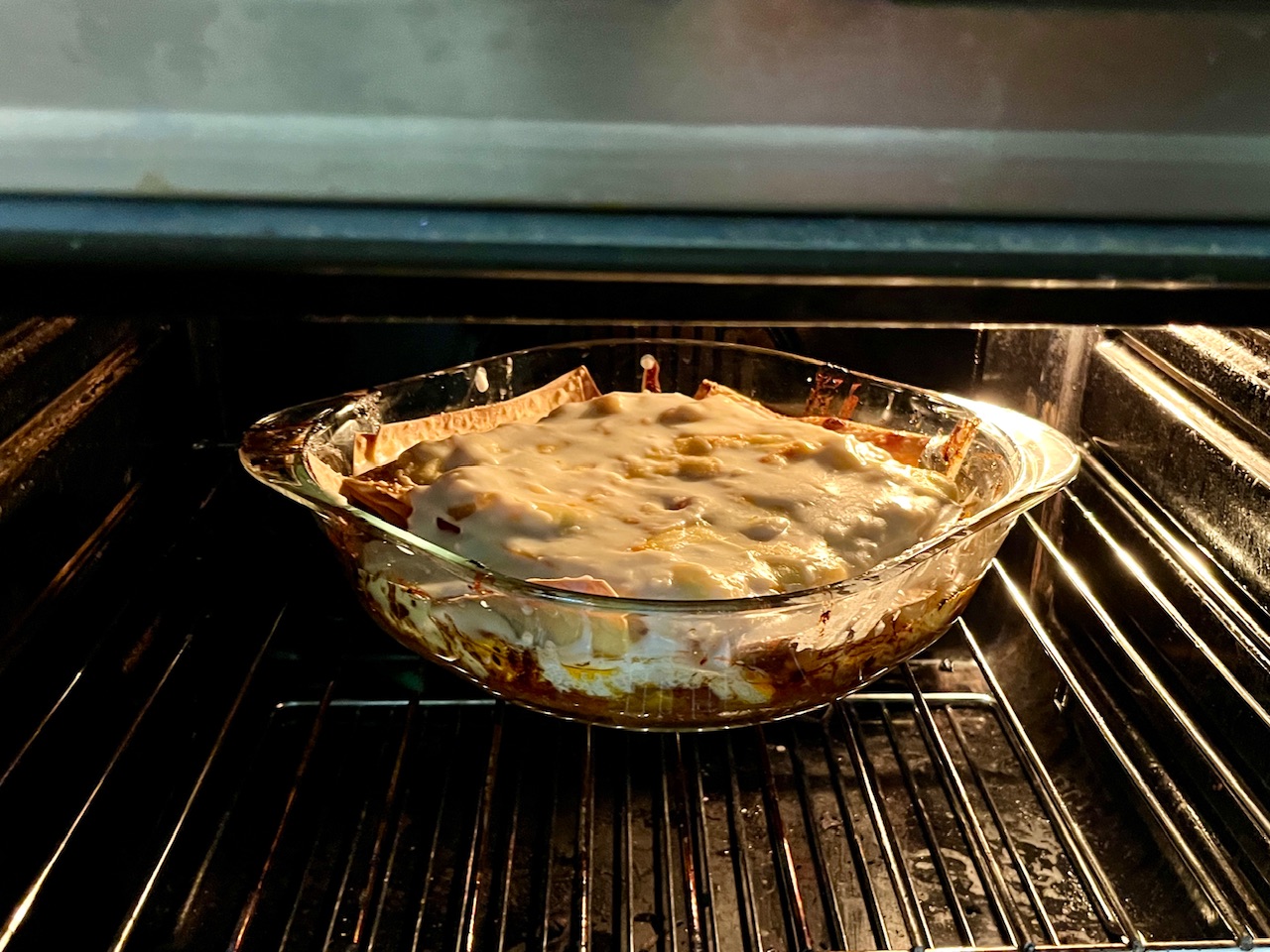 Ato bešamely liek kopā cepjoties visam cepeškrāsnī vai pēc tam pieliek?