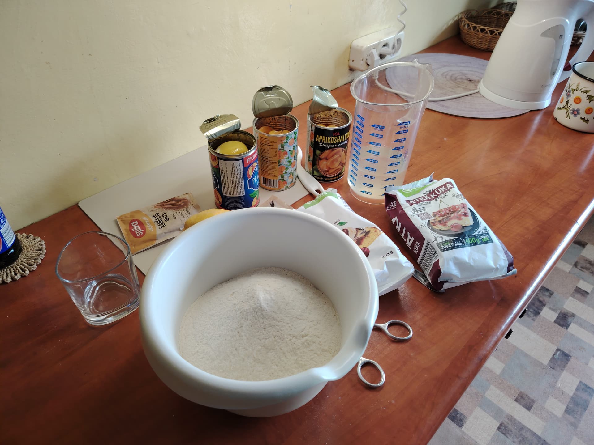 Saberam sausās sastāvdaļas, pielejam eļļu uz aci un ūdens vietā izmantojam sīrupu no augu konserviem, bet pēc norādītā apjoma. Šajā gadījumā ap 320ml. Nepieciešamību pēc papildus cukura izvērtēt pēc sīrupa salduma. Šie bija diezgan skābi tāpēc pievēršu vaniļas cukuru. Un beidzot biki citrona miziņu pierīvēt un visu samaisīt