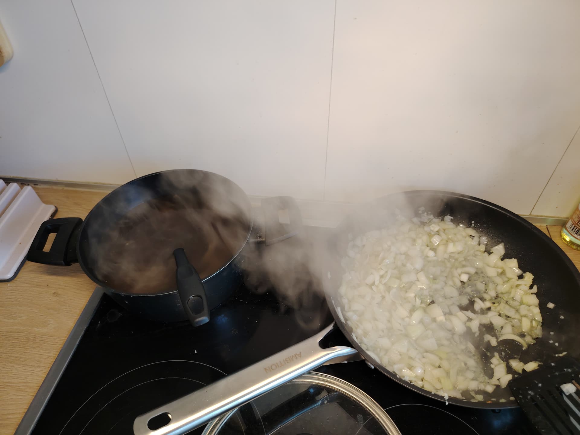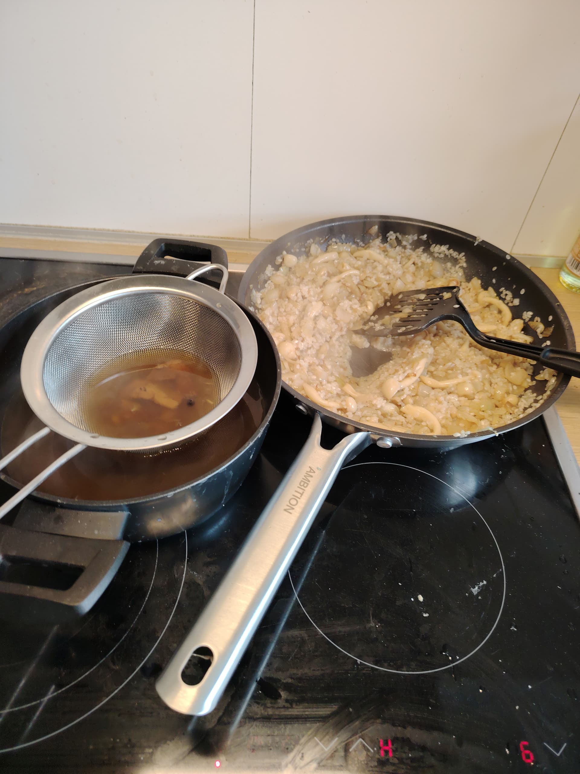 Kad buljons kādu stundiņu ir pavārijies var sākt ar pašiem rīsiem. Uzkarsētā pannā izkausē kubiciņu sviesta tajā apcep saspiestu ķiploku un sīki sakapātu sīpolu(vai divus). Kad sāk parādīties krāsa, jāliek klāt arī sēnes