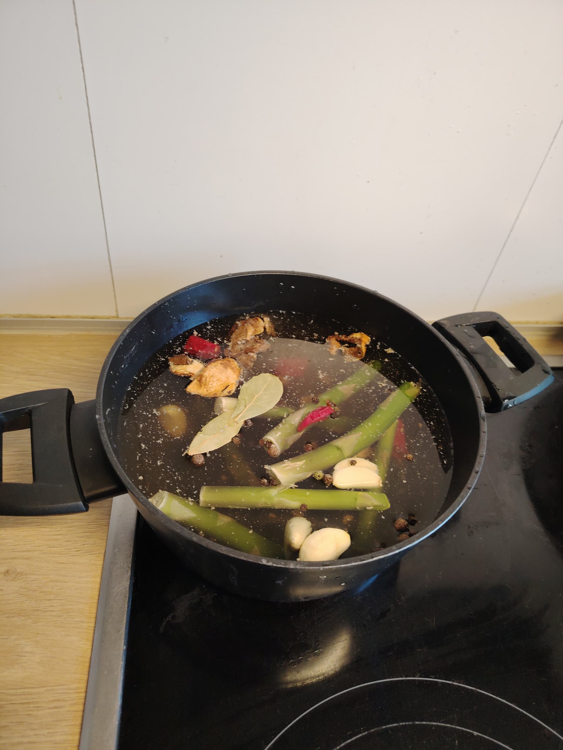 šoreiz izmantoju saldētavā uzkrājušos sparģeļu kātus, ķiploku daivas, vienu dabiskā ceļā kaltētu čili paksti, sauju ar melnajiem pipariem, seņu buljona kubiņu, sojas mērci, lauru lapas un pāris kaltētas baravikas