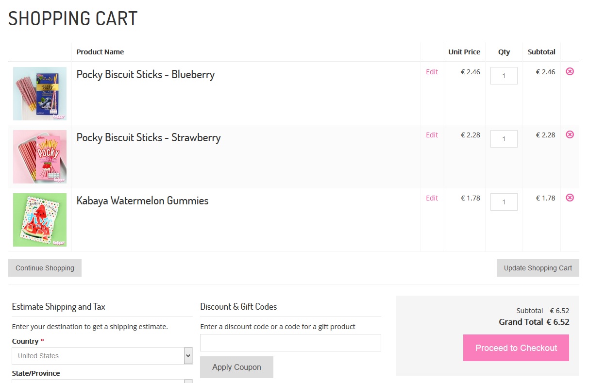 Cik noprotu, tad tiek sūtīts no Japānas, cenas ir diezgan nice, tur pa 2 dolāri var nopirkt strawberry pocky utt.