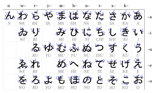 Pirmajās stundās mēs apgūsim hiraganu. Šī alfabēta burti ir radušies no steigā sarakstītajiem kandži hieroglifiem. Parasti visas zīmes japāņu valodā tiek rakstīti pēc šādas shēmas: 1. Zīmes tiek sāktas rakstītas no kreisā augšējā stūra un tiek beigtas rakstītas labajā apakšējā stūrī. 2. Horizontālās līnijas tiek rakstītas no kreisās uz labo pusi un vertikālās līnijas no augšas uz leju. 3. Vertikālā līnija, kas krusto horizontālo līniju, tiek rakstīta pēc horizontālās līnijas.