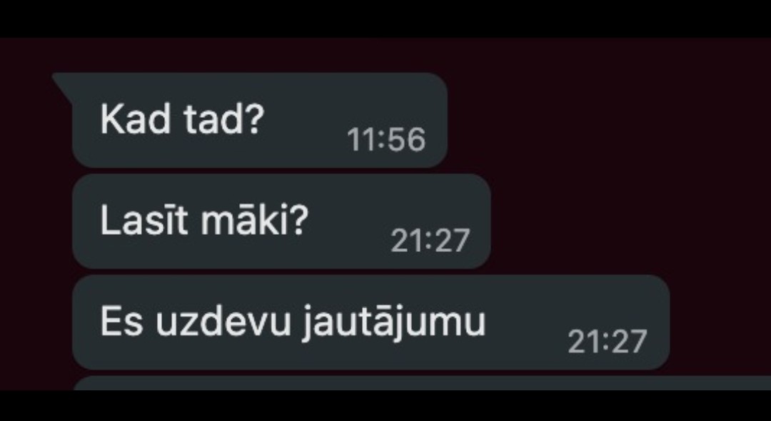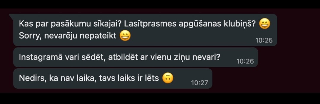 Akd, šitas man atgādināja vienu saraksti, ko man sūtija druška. Viņa čalim stundas laikā neatbildēja whatsapā, jo viņaj bija pasākums uzņēmumā, un viņa saņēma šitās ziņas:
