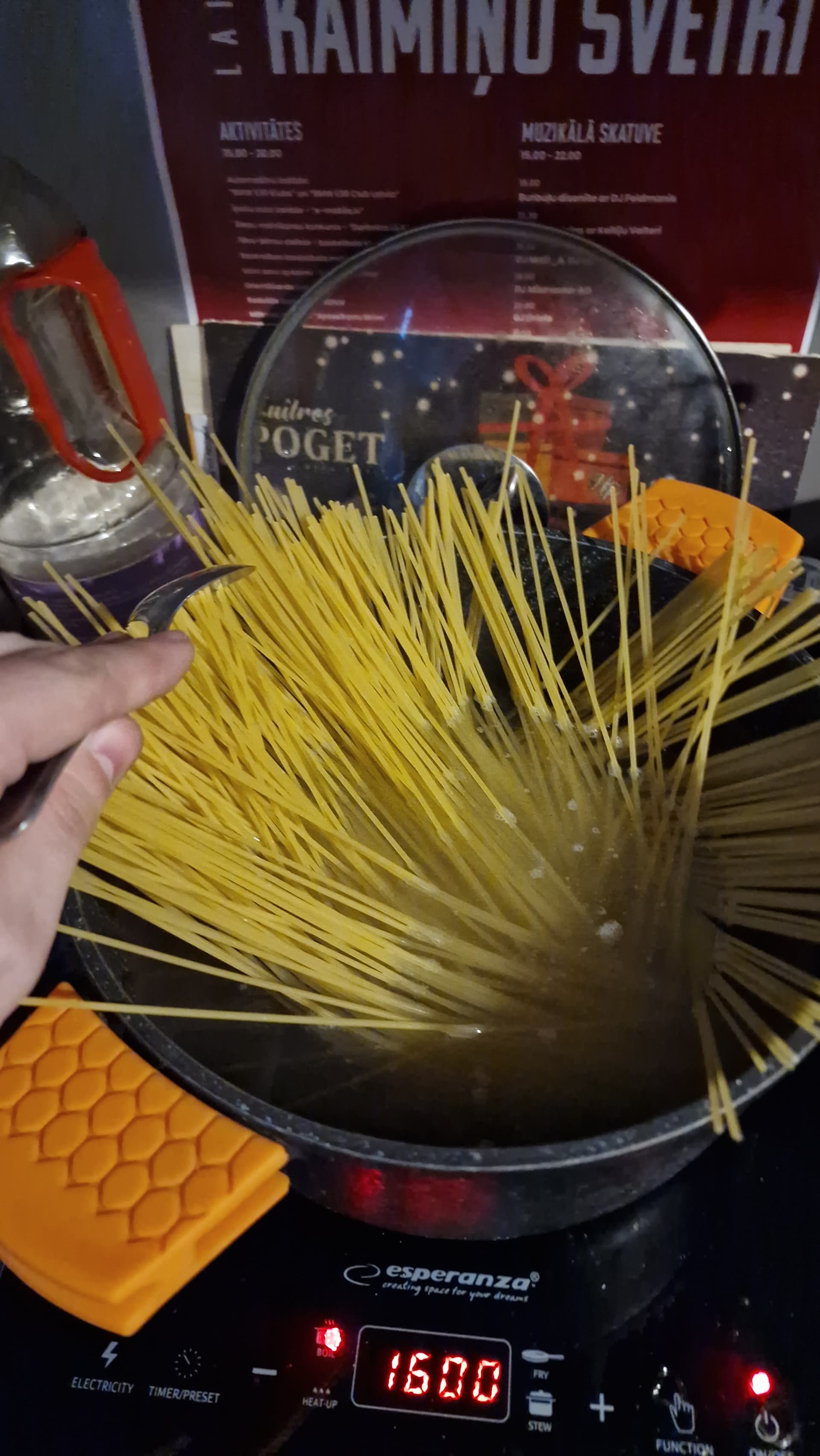 Es pirms likt pastu ūdenī paņemu rokā makaronu saišķi, mazliet to iegriežu un tad atlaižu to katliņā - tā lai izveidotos aplis ar stāvošiem makaroniem ap katliņa malu. Pēc tam tie lielā mērā paši ieslīd iekšā katliņā, piepalīdzēt vajag tikai īpaši spīdīgiem indivīdiem vai, ja tu steidzies.