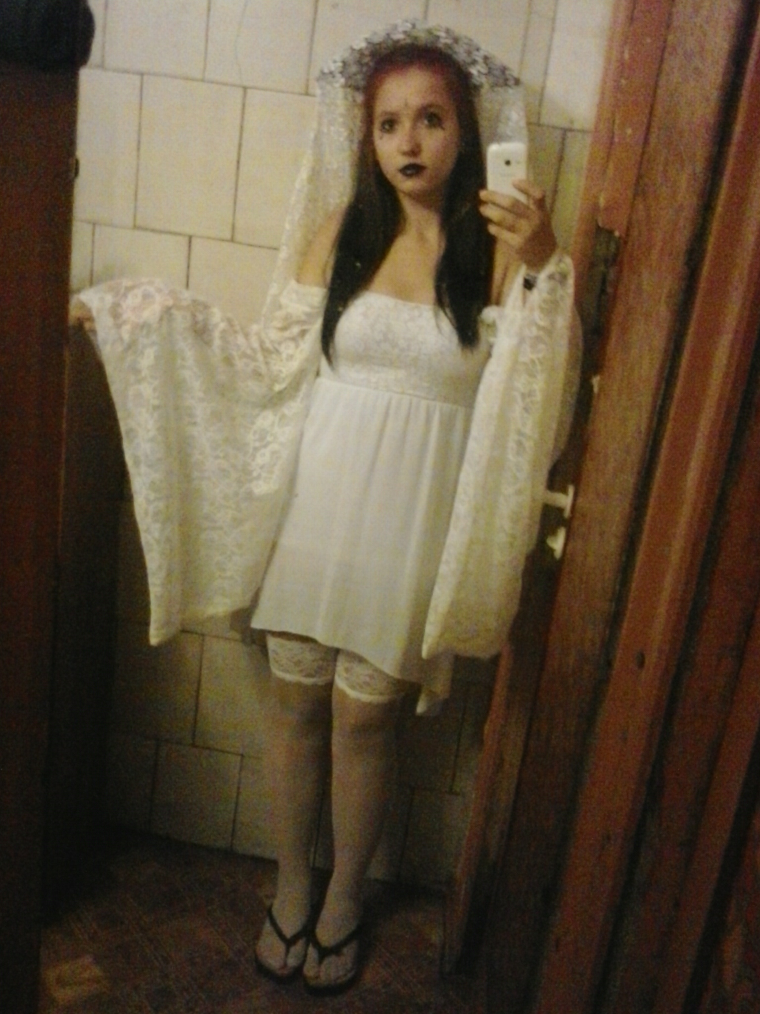 Tēls pa sevi atgādināja pretrunas pati sevī - pa maz melnāun pa maz baltā, lai nosauktu to par iņ un jaņ veidola tēlu, atkal viss balts, lai tēlam būtu pozitīvā vai vismaz neitrālā noskaņa…Bet tad parādās melnās ķeburīgās figūras uz sejas. Jā, tā viena uz pieres ir ok simbolismam, bet tās pie acu kaktiņiem liekas kā asaras. Asaras = skumjas. Tām, kas ir tuvu degunam un līdzinās trijstūriem - tām es galīgi neredzēju jēgu. Pats tērps likās vairāk sevis aizklājoš ar kapucei līdzīgo lietu uz galvas, garām piedurknēm utt… bet atkal pastoties uz kājām tur ir garās zeķes - ļoti atklājošs elements. Vēdeklis atkal ir speciāls atribūts… kuš laikam nosaka presonalitāti.