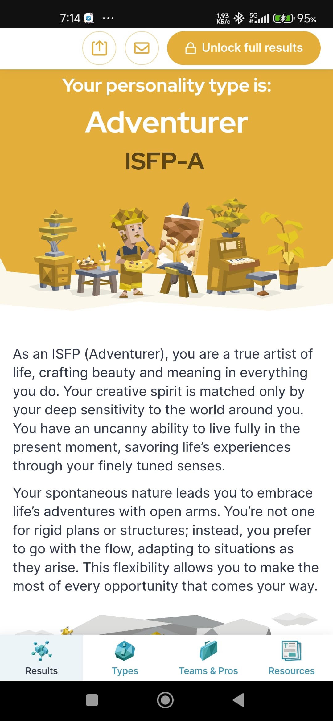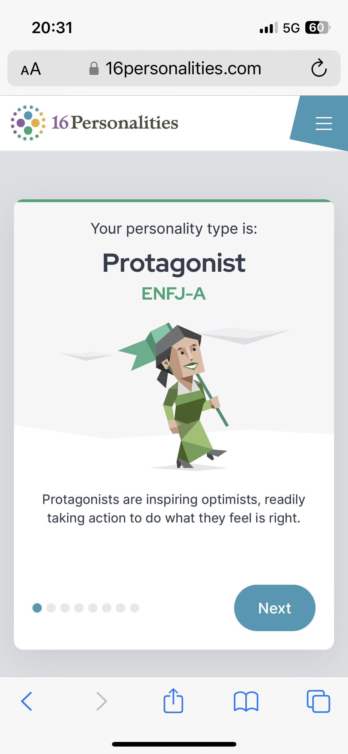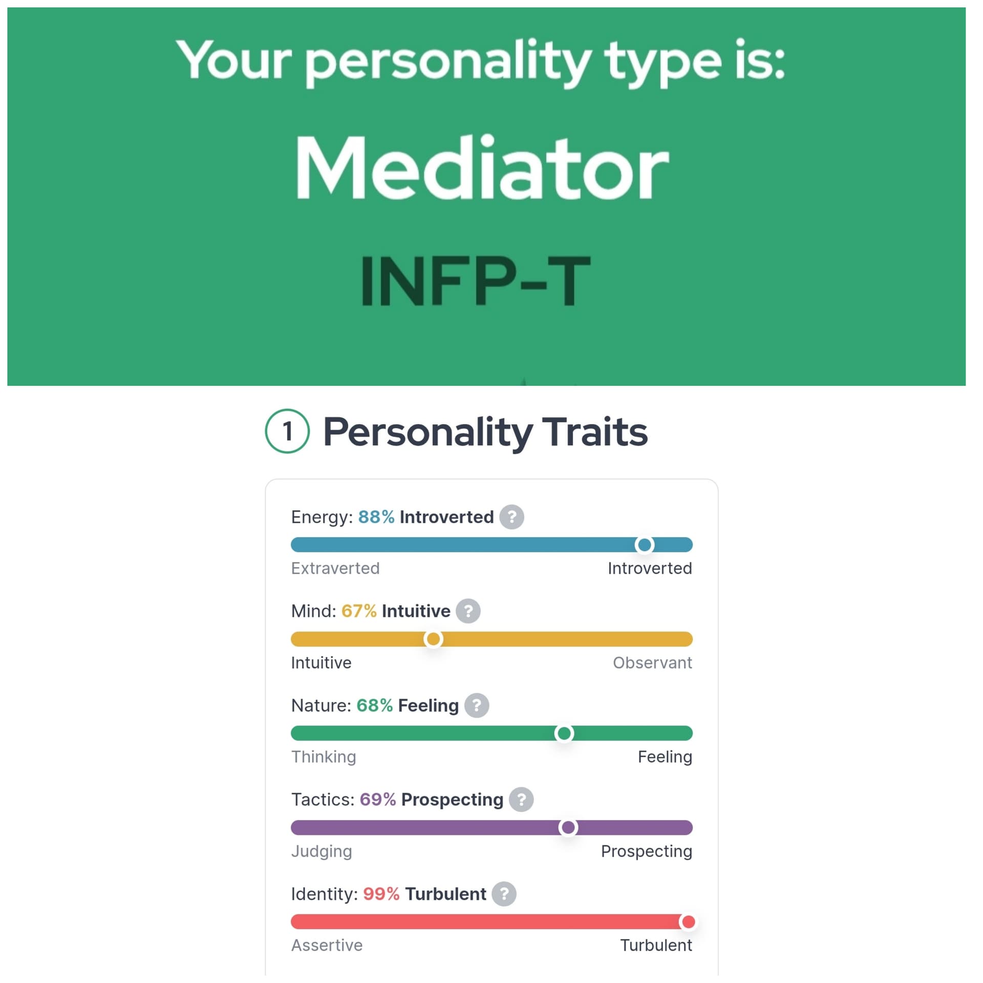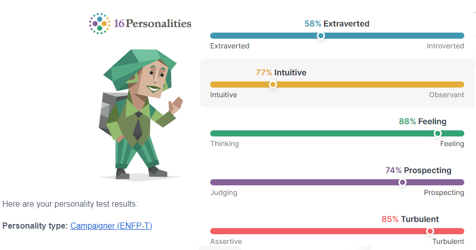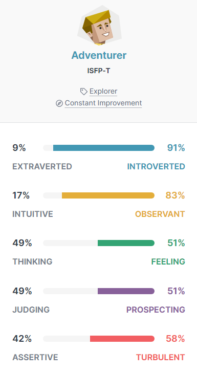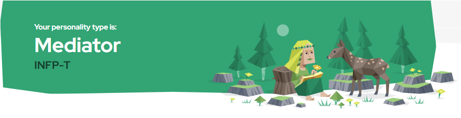 Arī esmu INFP - šo testu esmu darījis arī padziļinātāk - pat lasījis arī grāmatu. Daudzas lietas, kas tika minētās, bija arī iezīmes, ko pats sev biju novērojis. Protams, tās var mainīt un pielāgot situācijām, bet pats jūtu - kad varu sevi izaicināt, kad varu būt tas komandas saliedētājs un arī momenti, kad varu būt pats ar sevi.