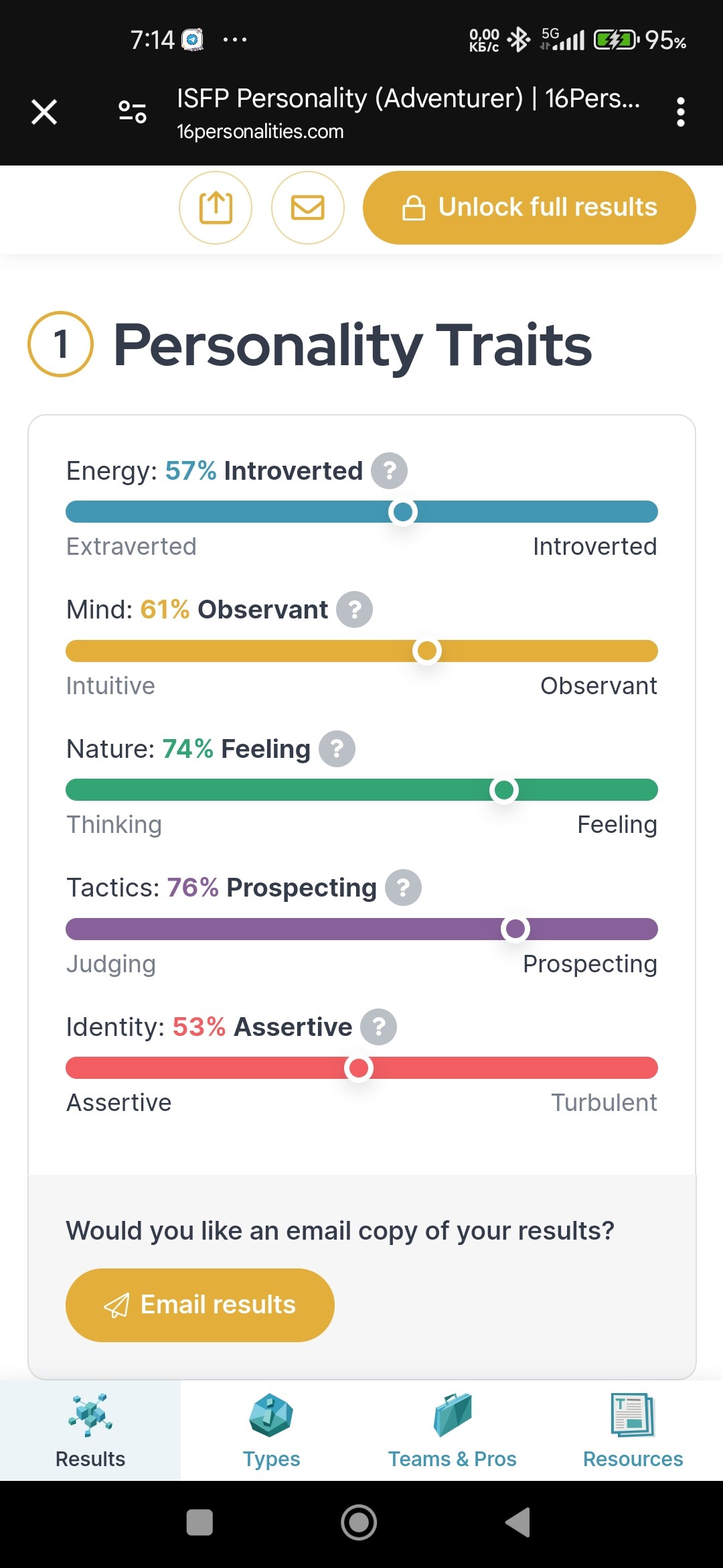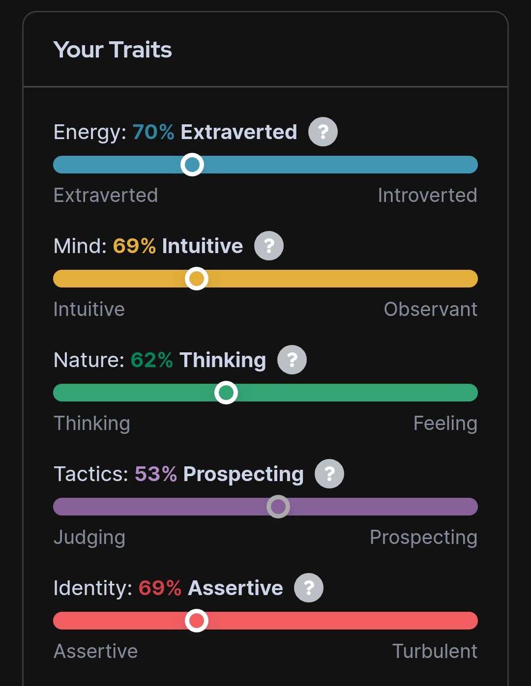 Sāku ar ISTP-A, tad kļuvu par ENFP-A un nu esmu ESTP-A. Laikam tāpēc ka visu laiku esmu uz 50% robežas