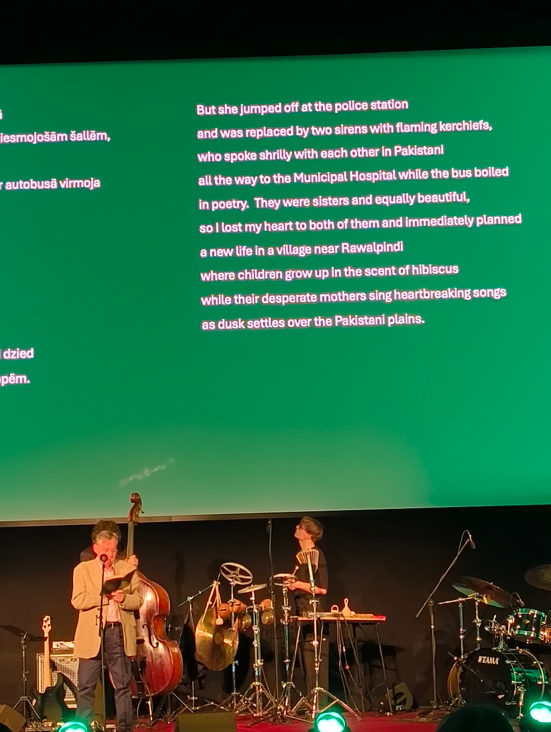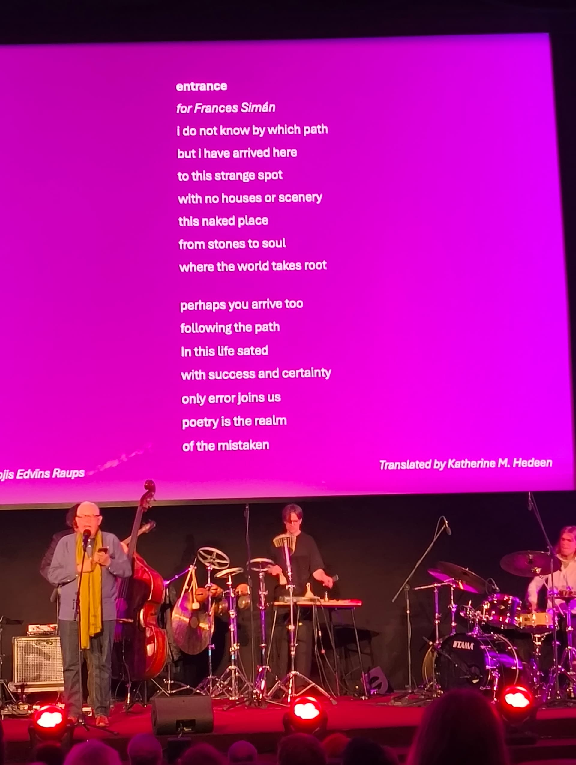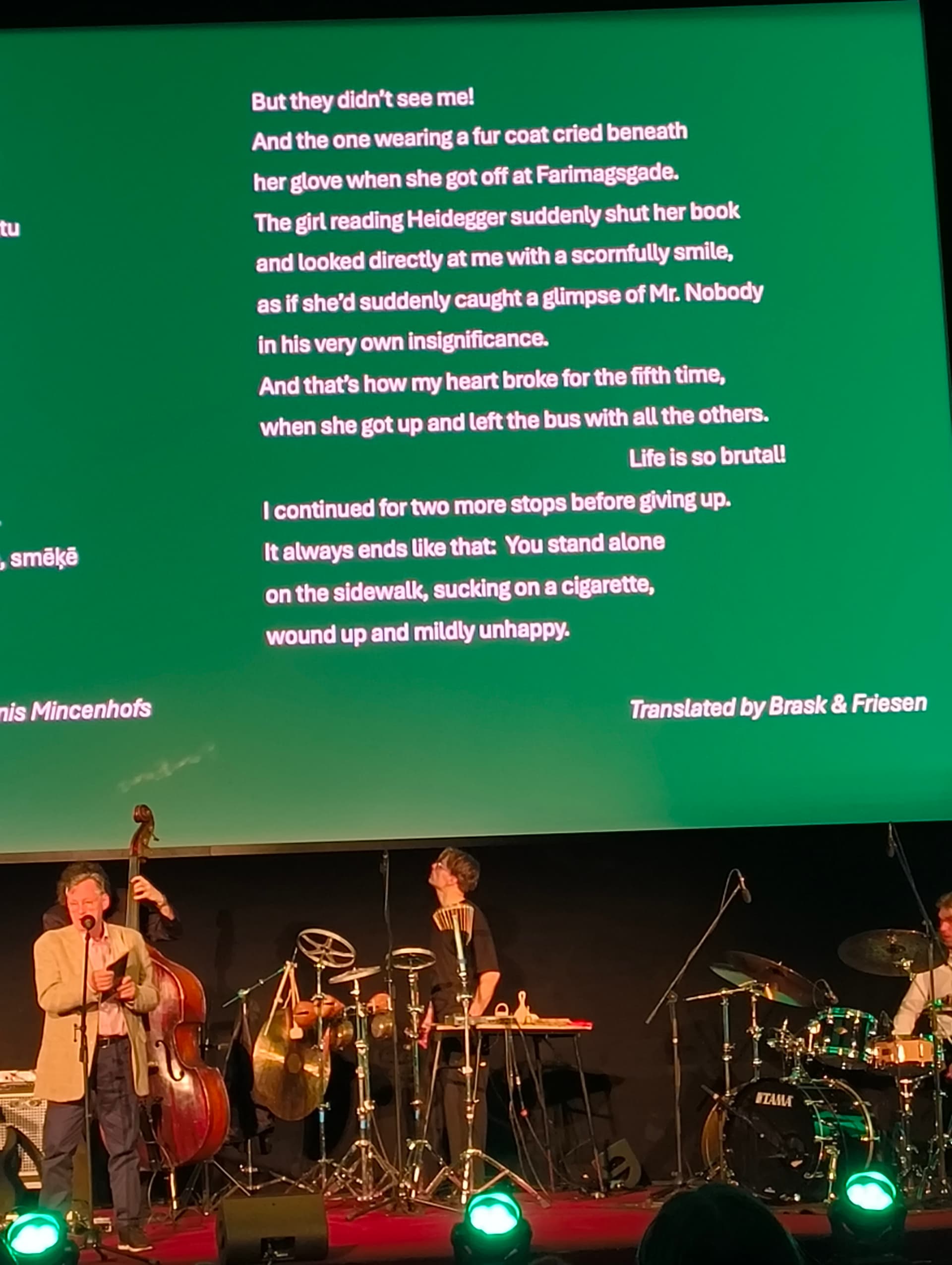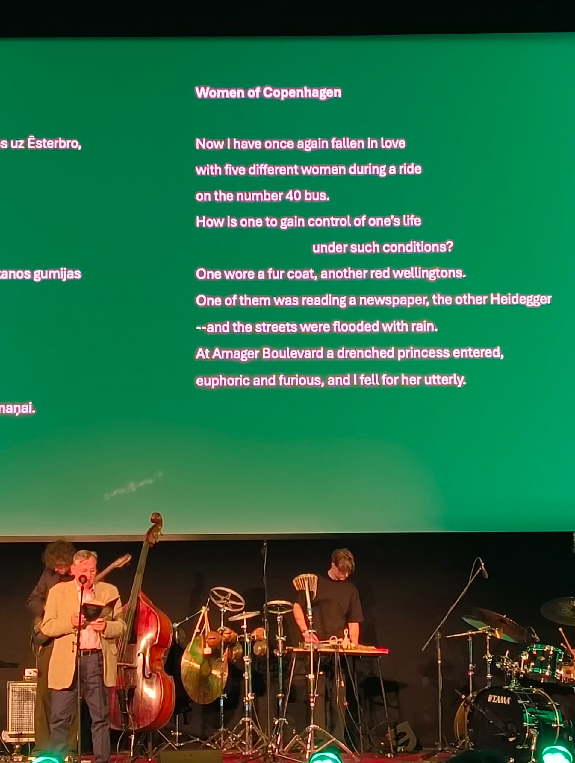 Šeit ir divi no dzejoļiem, kas man patika- zaļais no Niels Hav (Dānija), rozā no Viktor Rodríguez Núñez (Kuba). Dzejnieki lasīja katrs savā valodā un uz ekrāna bija tulkojumi latviešu un angļu valodā.(: Arī pirmo reizi dzirdēju dzeju no Ērikas Bērziņas un Ilmāra Šlāpina un vienkārši iemīlējos, jāiet nopirkt viņu dzejoļu krājumus.