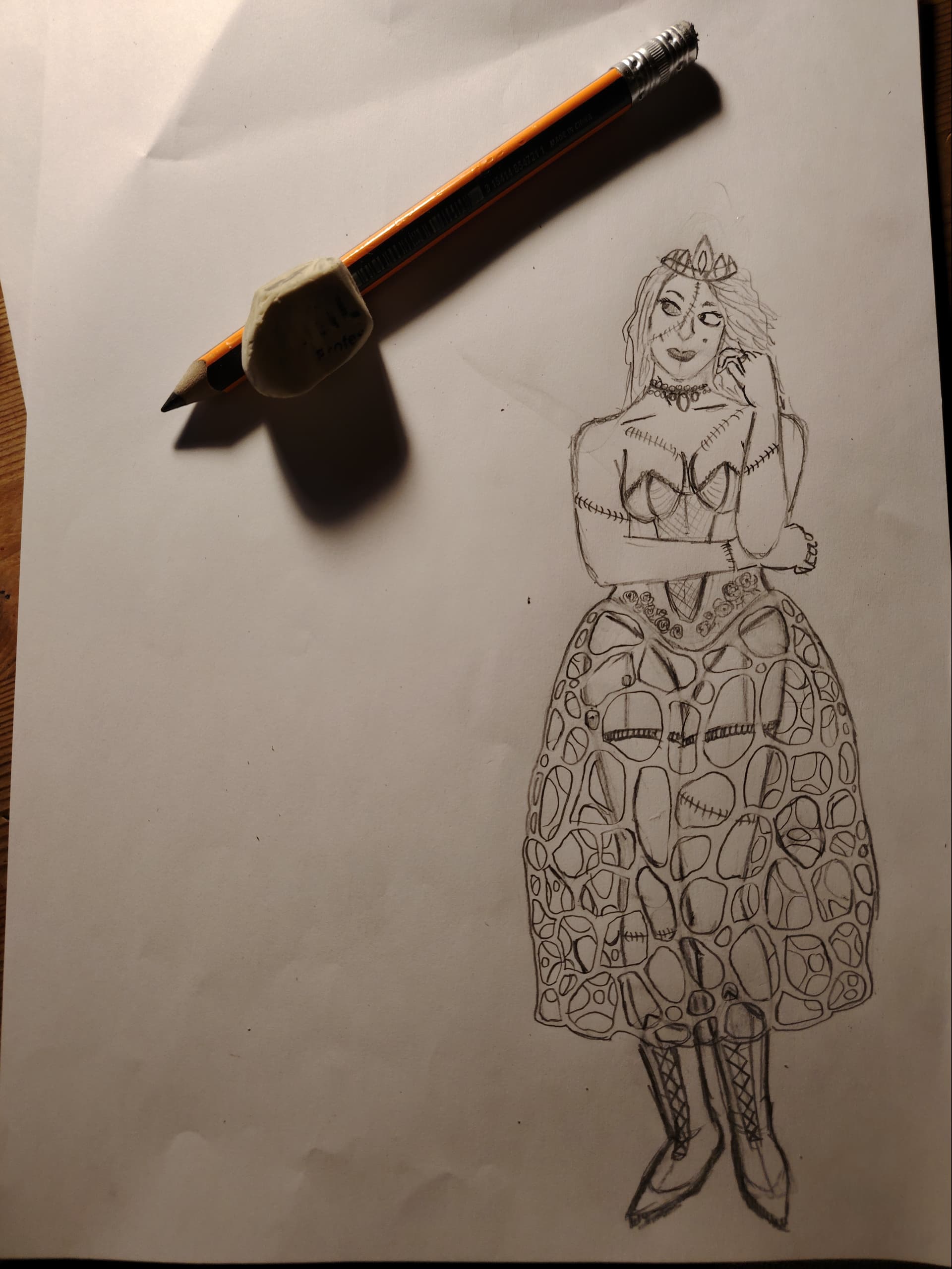 Biki palasīju par šo sēni, pirmais ka iekrita acīs ir skaistuma pretstats ar briesmīgu plūstošās gaļas smaku - radniecīgs mūsu pašu zemes taukiem. Tomēr par spīti šaj smaka tā jau izsenis ir uzskatīta par delikatesi senajā Ķīnā un ne tikai. Līdz ar to es gribēju kādus aristokrātiskus elementus. Un visbeidzot pati sēne man vizuāli atgādina kuplus, bet neko daudz nenosedzošus svārkus caur kuriem var redzēt bālas kājas. Izrādās ne es vienīgais tā domāju, jo sugas vārds indusiatus no latīņu valodas nozīmē “tērpies apakšveļā”. Pluss tā sēne tika uzskatīta pa afrodiziaku. Līdz ar to viegli erotiska, rokoko stila(jauka sakritība jo sugu atklāja francūzis) zombij atistokrāte