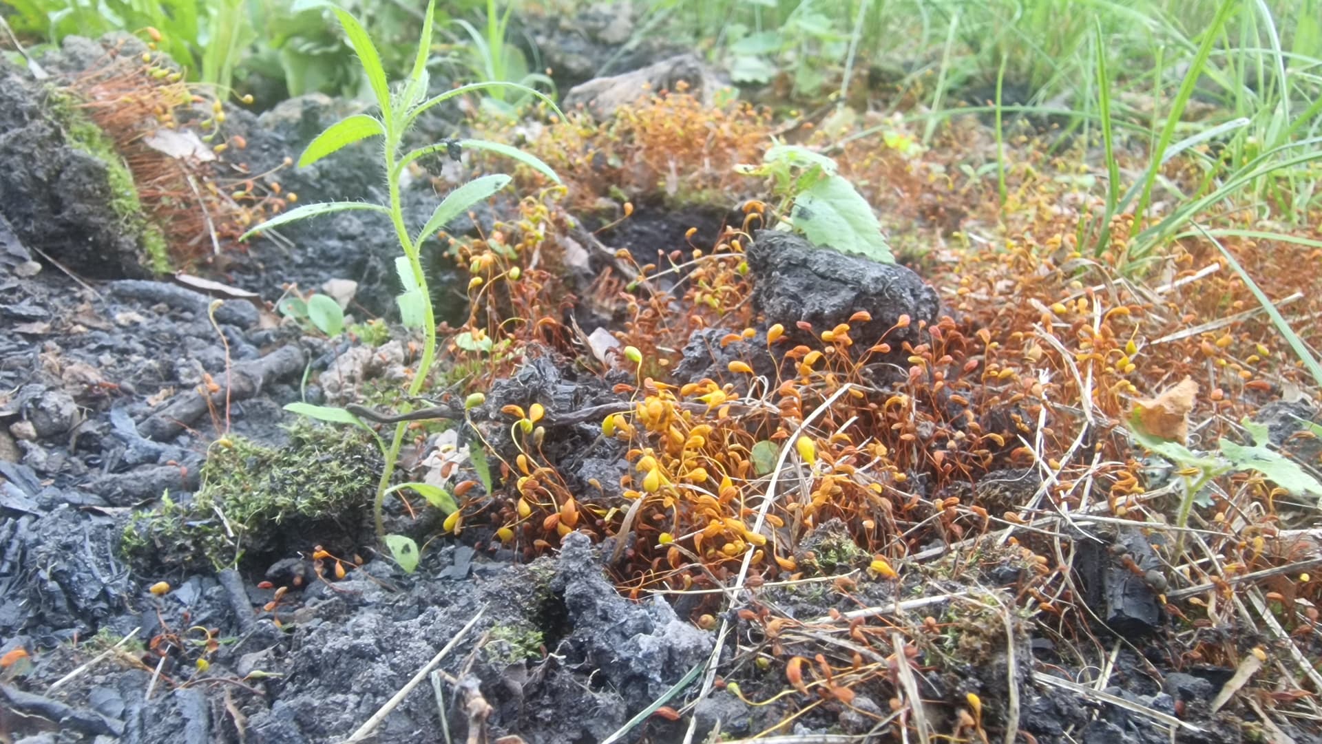 Bijušā ugunskura malā saaugusi interesanta sūna gandrīz kā no vulkāniskas biomas