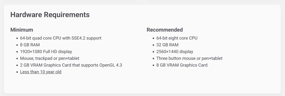 Minimālās vispār neko nenozīmē, tā ir 3D renderēšana. Blenderi var izmantot visādām vienkāršām, lightweight lietām, bet 3D modelēšana, ja vien netaisa super prastas lietas, nav lightweight.