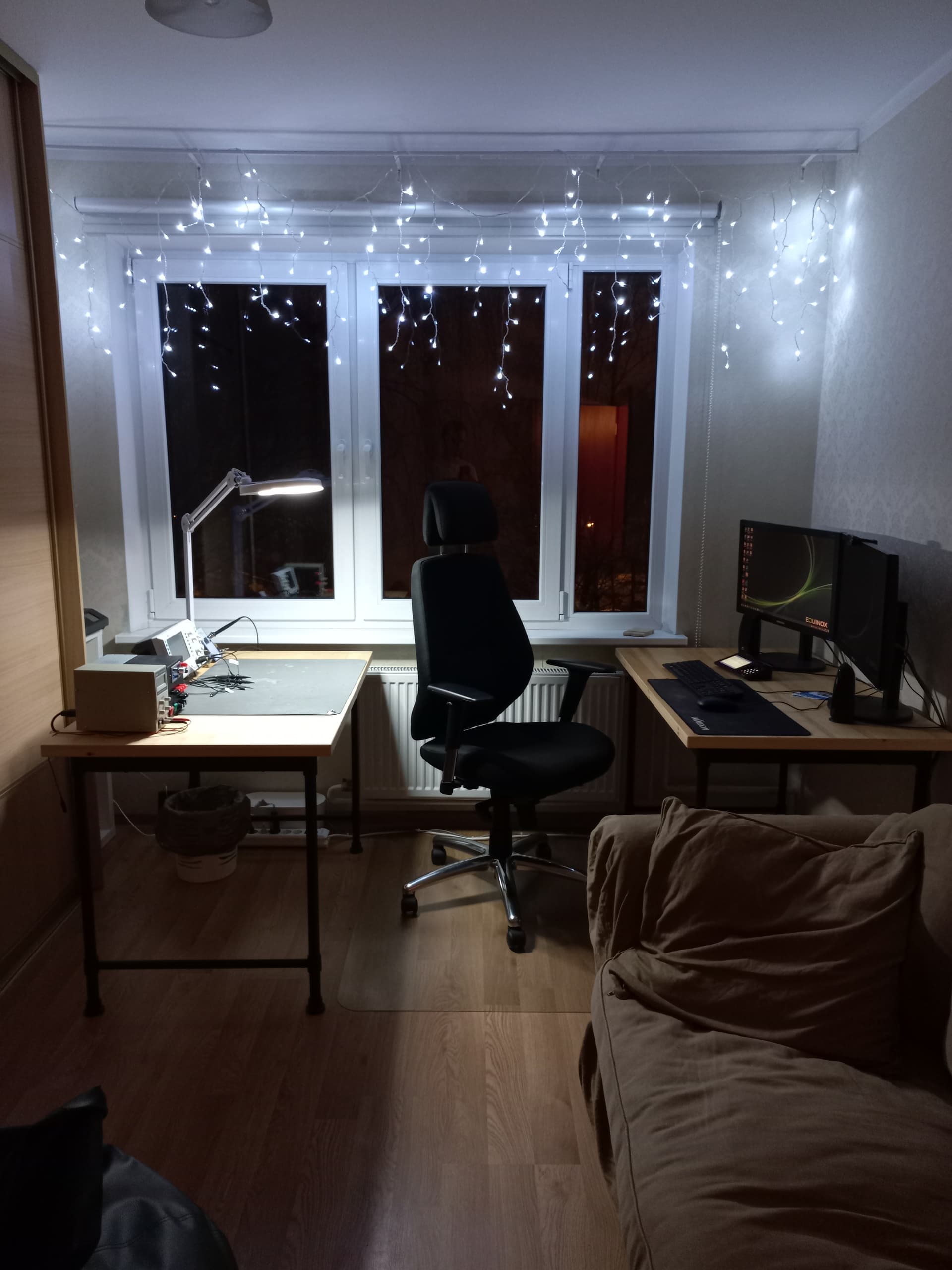 Manā dzīvojamajā istabā jau no sākta gala bija sarežģīta situācija ar mēbeļu izvietojumu. Tāpēc, tolaik ievācoties, šis bija mans labākais risinājums kur bija pa vienam galdam abās datorkrēsla pusēs: