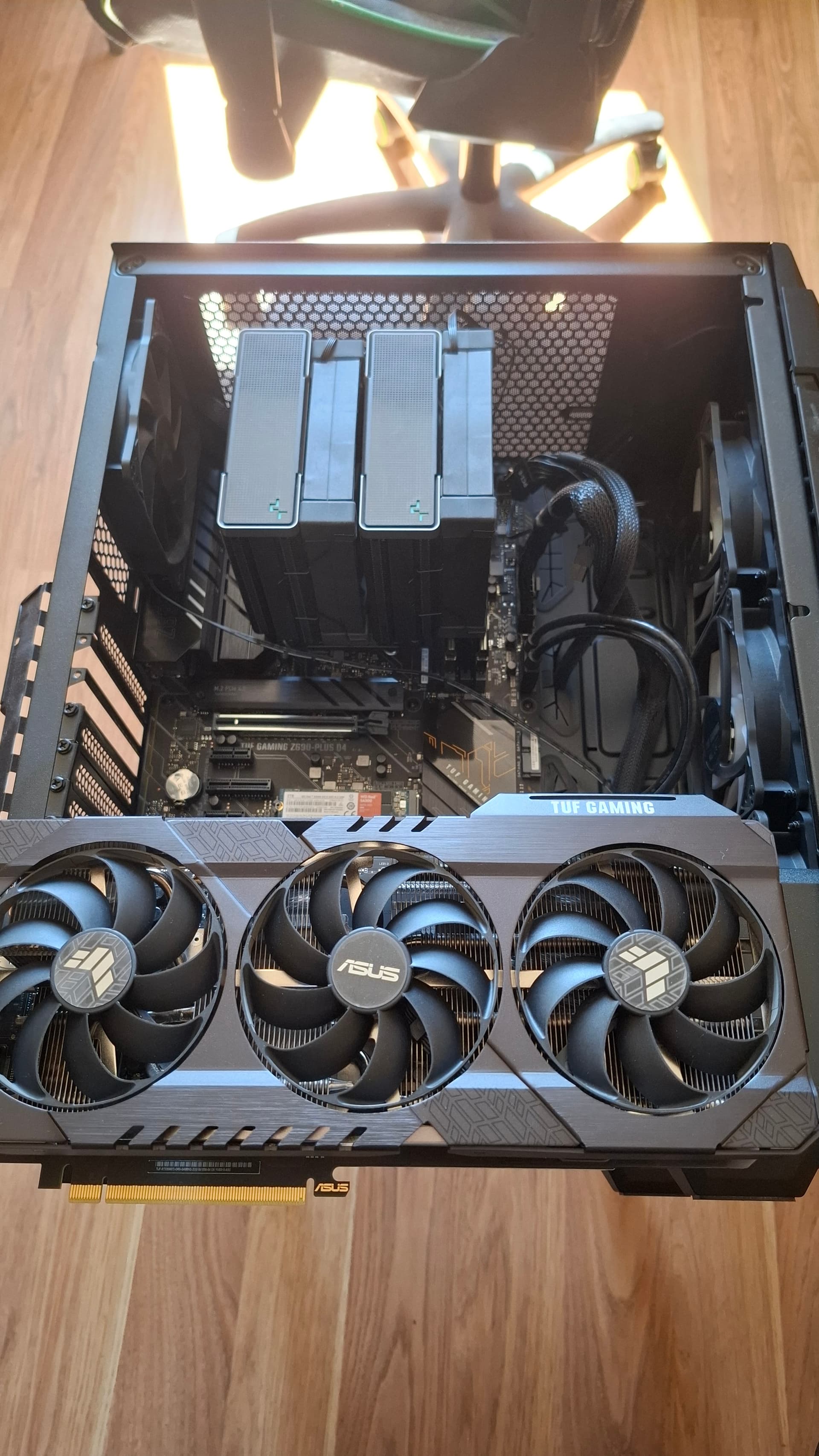 Tā kaste nāca bez jebkāda psu shroud tāpēc nācās taisīt savu no random bleķa gabala. Balts tāpēc ka bija doma kko uzzīmēt, bet palika bail sačakarēt. Un vertikālais baltais klucis ir videokartes pagaidu atbalsts because the sag comes for us all. Pagaidām ieliku gabaliņu no tām putuplasta griestu līstēm, jo bija palikušas no remonta un perfektā izmērā. ![]()