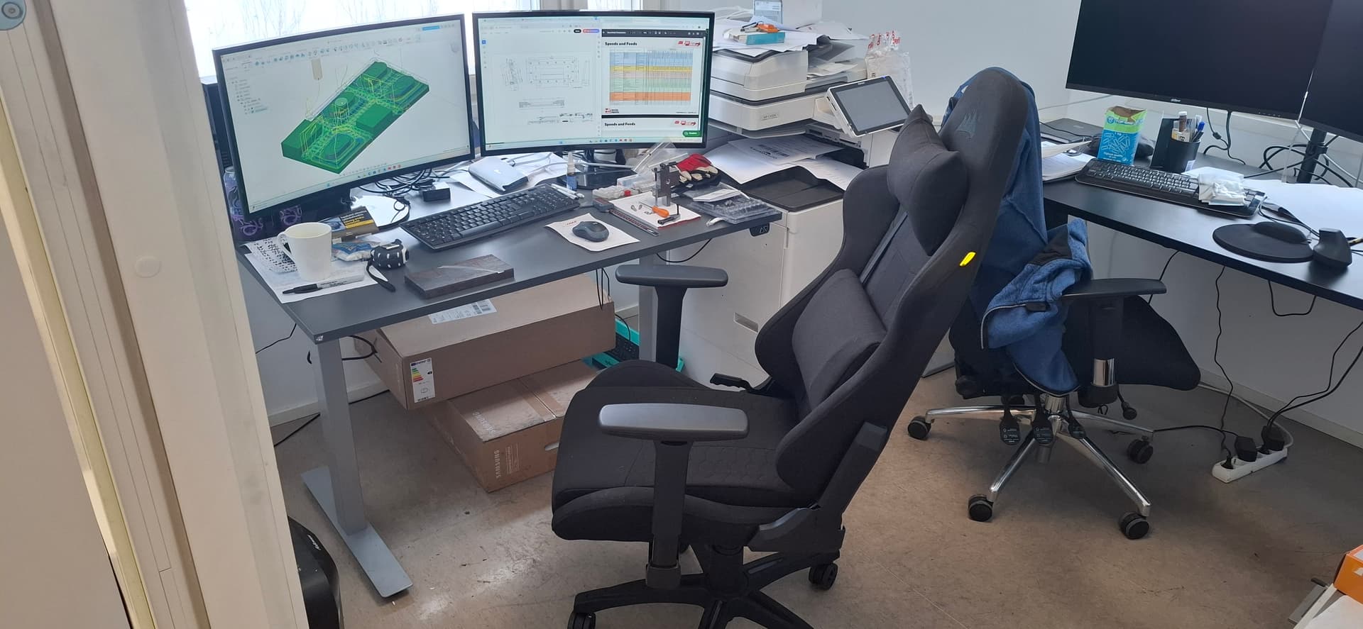 Update par darbavietas izkārtojumu, apsveicot, ka esmu veiksmīgi izgatavojis 3 detaļas, man, kā smējāmies, algas vietā nopirka Corsair datorkrēslu.