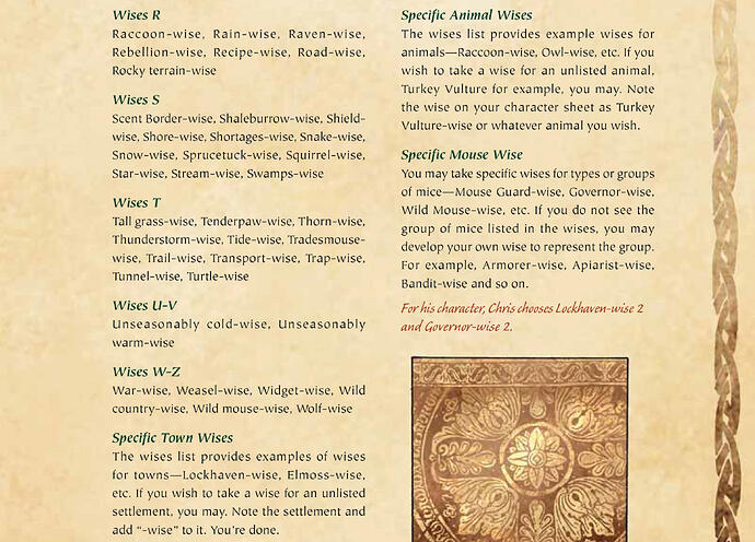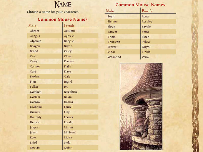 Choose a mouse town or city in which your character was born. Each city has its own culture as represented by the skills and traits it provides.