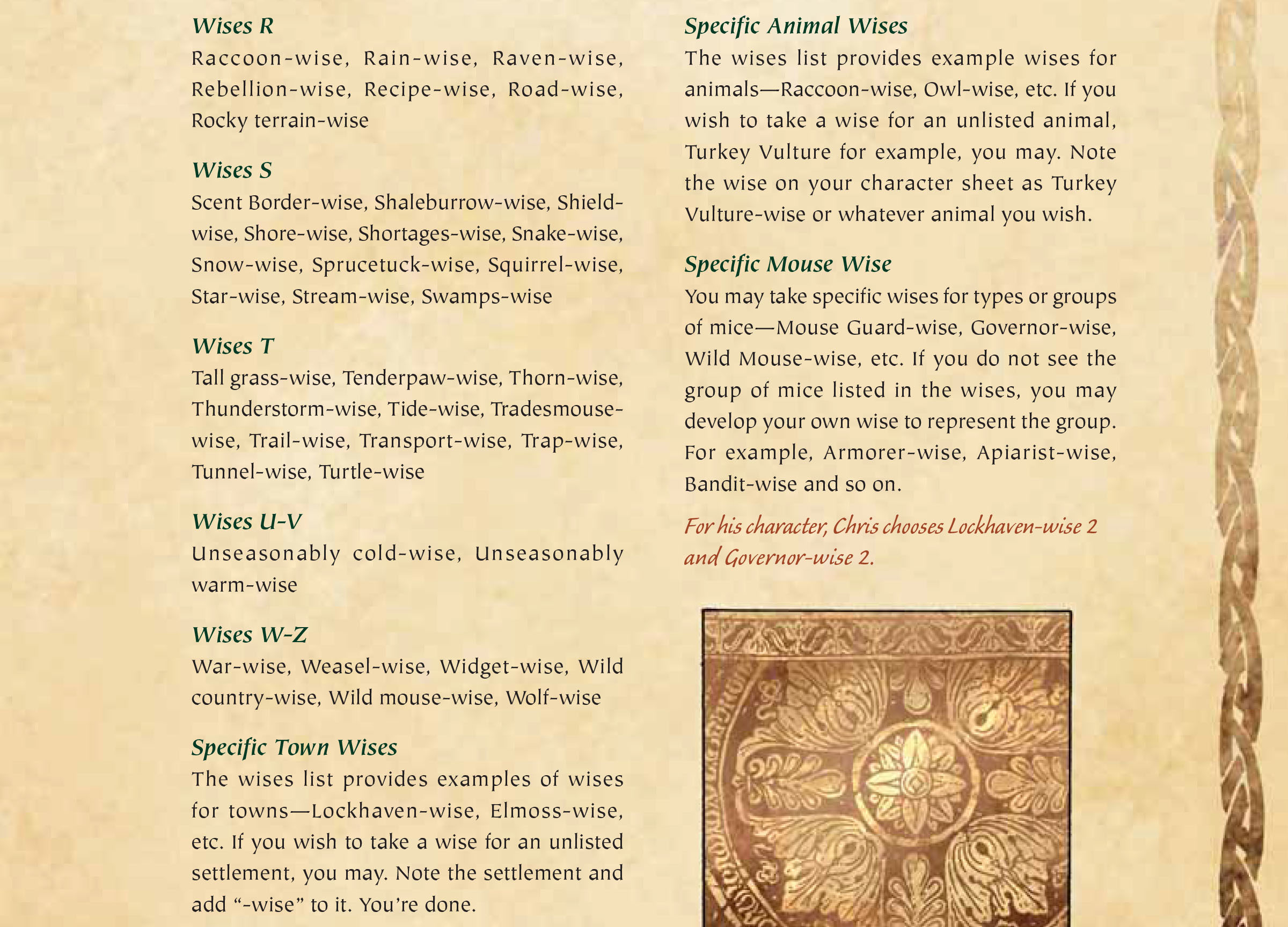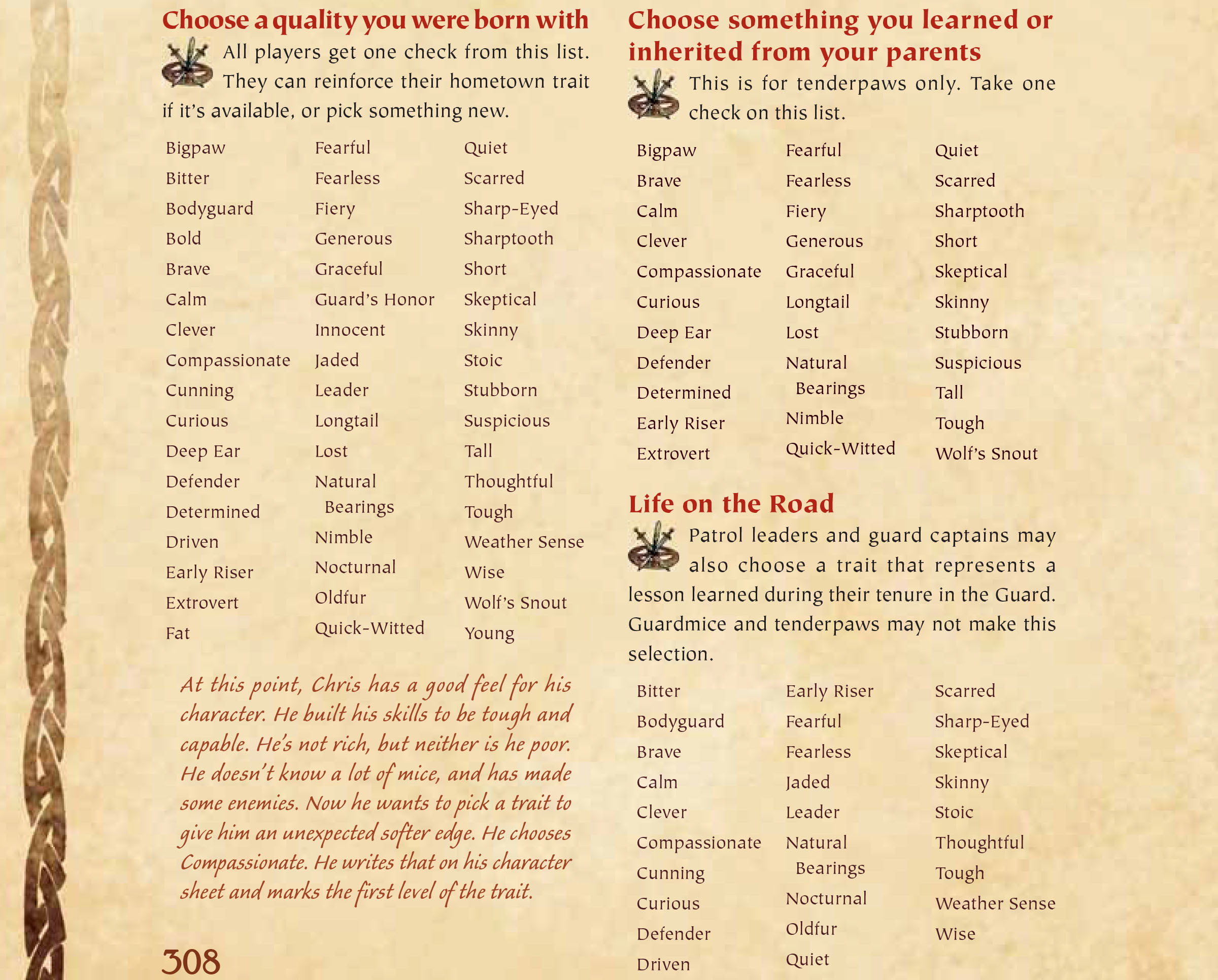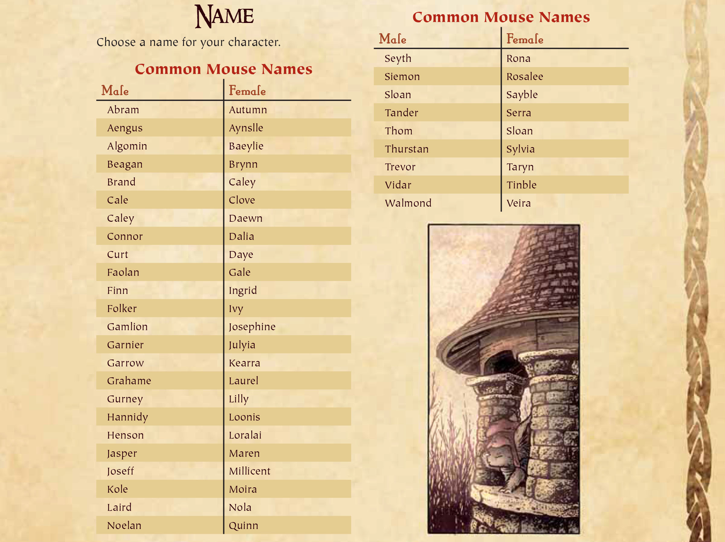 300 - Lockhaven The home of the Mouse Guard. Skills: Weaver, Armorer Traits: Generous, Guard’s Honor