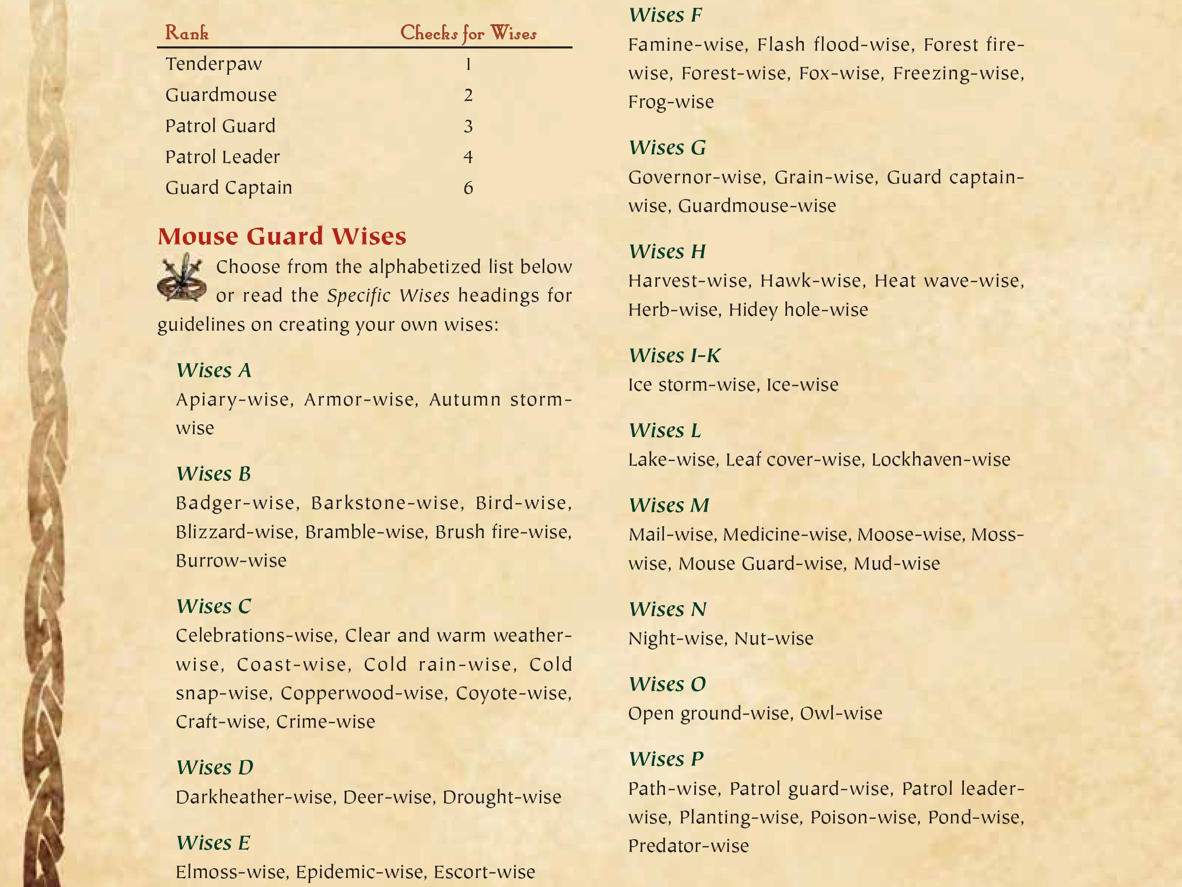 You may choose from the following skill list based on your experience with the Guard. You may make a number of checks based on your ranking as follows: tenderpaw 3, guardmouse 6, patrol guard 8, patrol leader 9, guard captain 12.