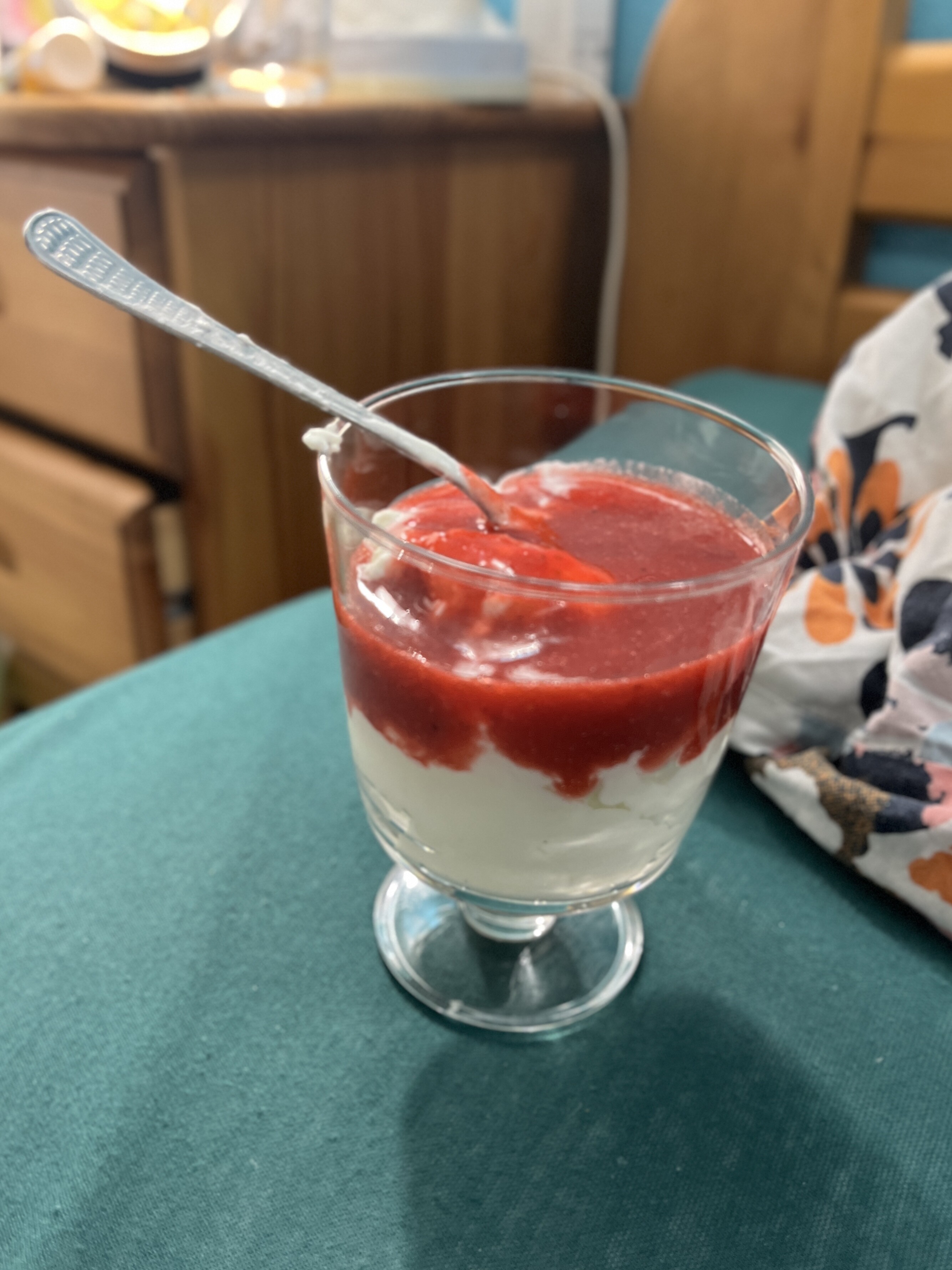 Pamēģināju vienu recepti no TikToka. Ir jānopērk jebkurš (ar tādu garšu kādu vēlies) jogurts un arī cepumus pēc izvēles. Es nolēmu nopirkt šo jogurtu, viņam garša ir skāba un cepumus selga. Sabāzu cepumus jogurta iekšā un noliku ledusskapī uz 4h - 5h. Un voļa, gatavs! Ļoti garšīgi. Dodu 8 balles