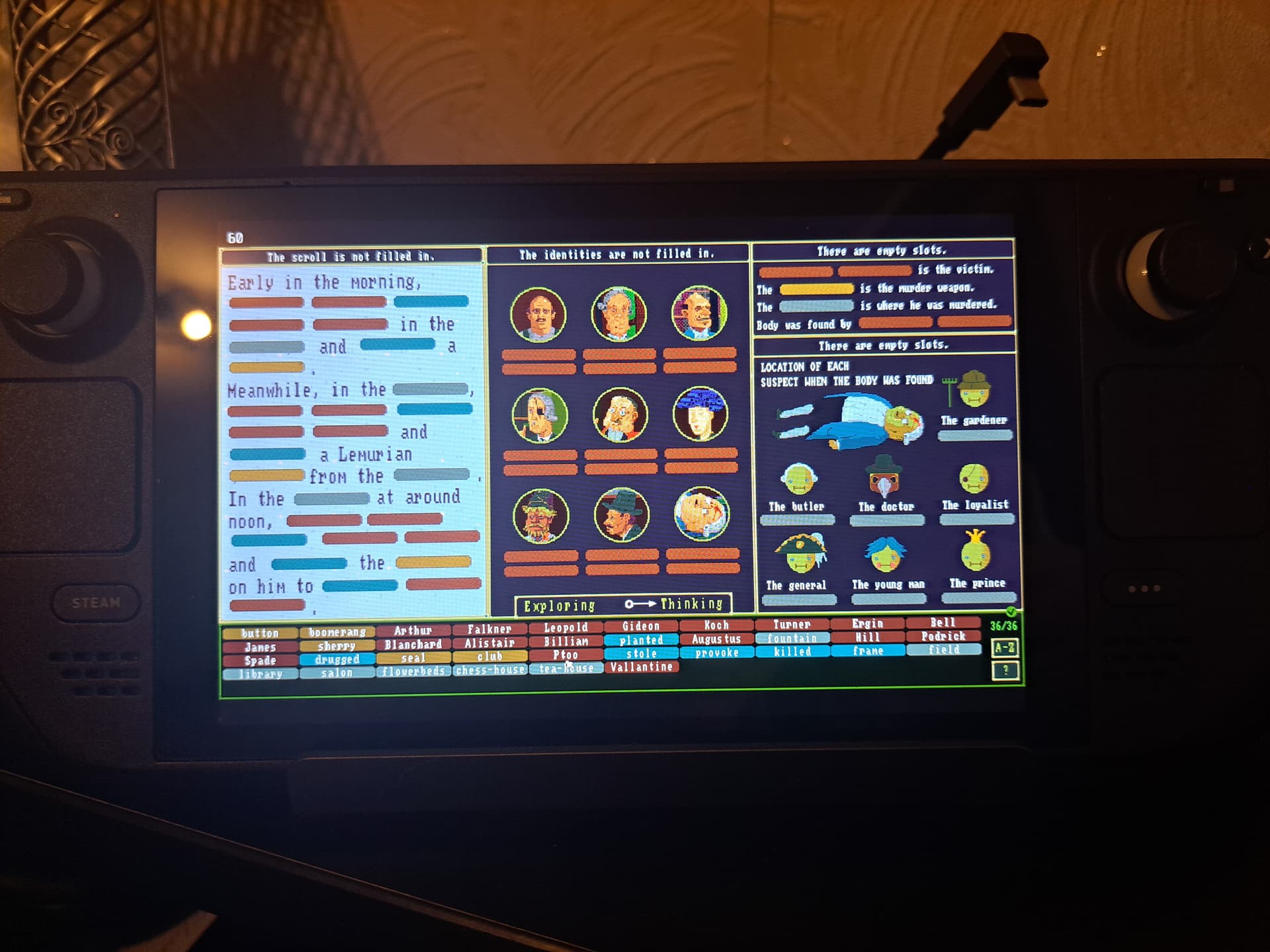 Kad visi pavedieni ir atrasti ( var jau protams arī ātrāk), laiks risināt “mīklas”. Katrs scenārijs sastāv no vairākām “mīklām”. Pati galvenā ir senārija apraksts, kas ir līdzīgs galda spēlei Clue. Tev ir dots apraksts ar iztrūkstošiem vārdiem un tad pareizi ir jāsaliek no atrastajiem hintiem trūkstošajās vietās. Piemēram: Antons gribēja appēst Kokosriekstu, bet Ljuba to saindēja ar Dillēm. Atminot galveno mīklu scenārijs ir iziets, taču ir vēl papildus mīklas, kas palīdz atminēt galveno. Piemēram, salikt kurš ir katrs cilvēks scenārijā, vai ko apzīmē konkrētās lietas utml… Ja gadījumā ir 1 vai 2 kļūdas minējumā spēle par to paziņo. Ir arī iespējams izmantot Hintus.