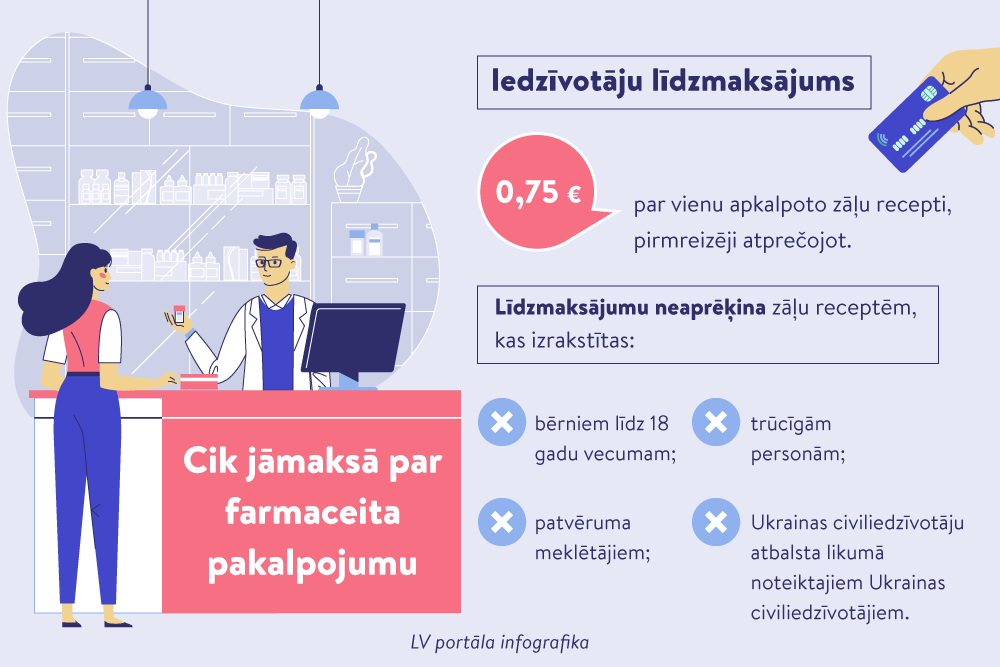 Neatkarīgi no tā, kurā Latvijas vietā aptieka atrodas un kāda ir tai paredzētā samaksa par farmaceita sniegto pakalpojumu, iedzīvotāja maksājums paliek nemainīgs – 0,75 eiro par vienu apkalpoto recepti.